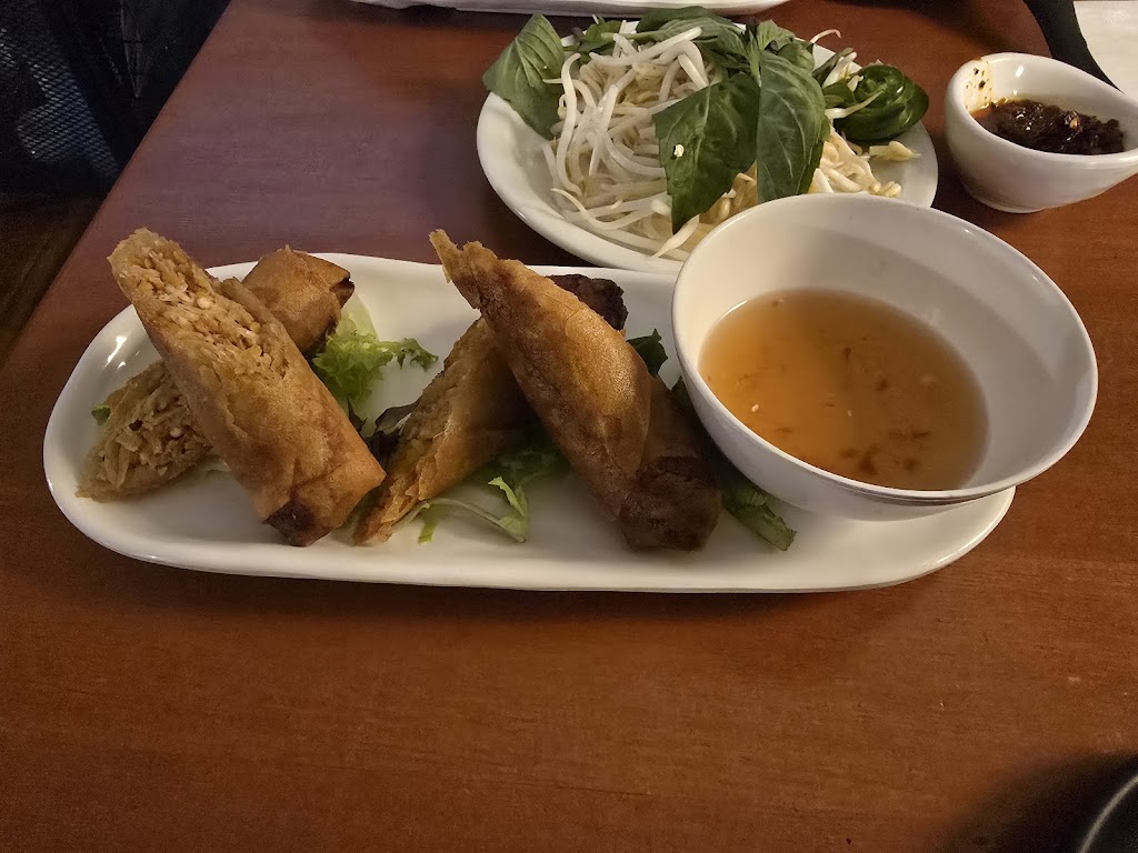 Lunch at OP Giant vegetable spring roll with peanut sauce; could have shared and same for meals: really tasty lemongrass chicken and I had the steak brisket meatball pho. Our server was friendly and fast and checked on us every few minutes. Pleasant warm ambience; had one of about 5 tables upstairs. Had a bathroom on each level. Great choice for lunch!