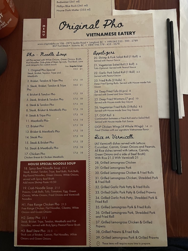 If you havent tried Original Pho in Langford, youve missed out on some incredible Vietnamesr dishes and drinks! Well, theyve just opening downtown on Fort St. Same awesome menu, same delicious drinks, and best of all, same top level service and quality! Absolute must try! Vegetarian options: They offer some incredible veggie options!! Must try! Dietary restrictions: With proper notice there are many options available to customize for individual needs. Kid-friendliness: Parents constantly surprised how much their kid loves the soup or noodle and rice dishes. Wheelchair accessibility: Wheelchair accessible, with a few tables available.