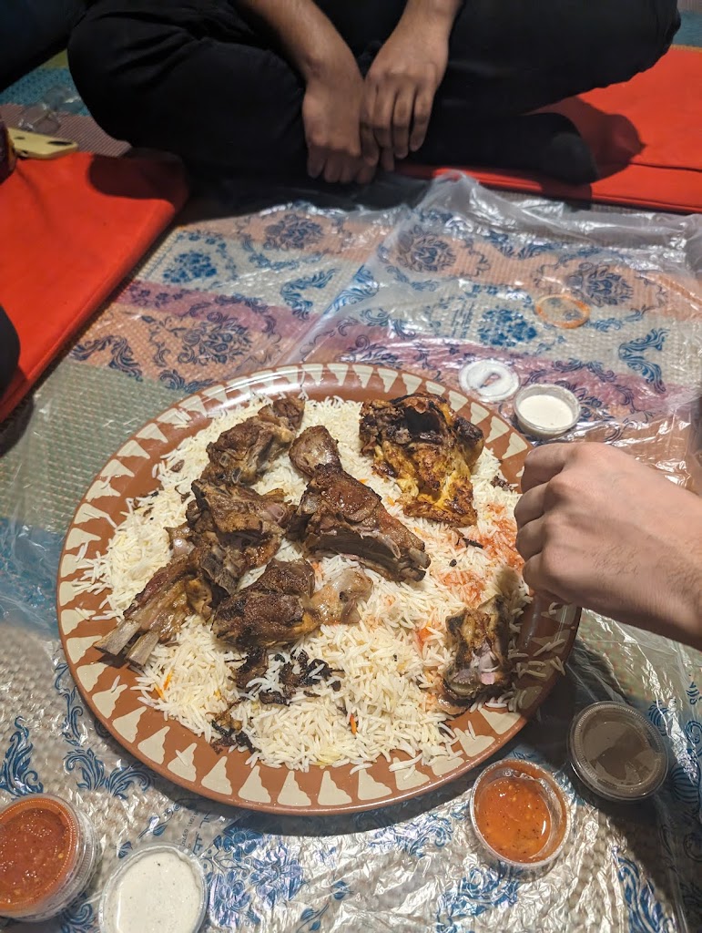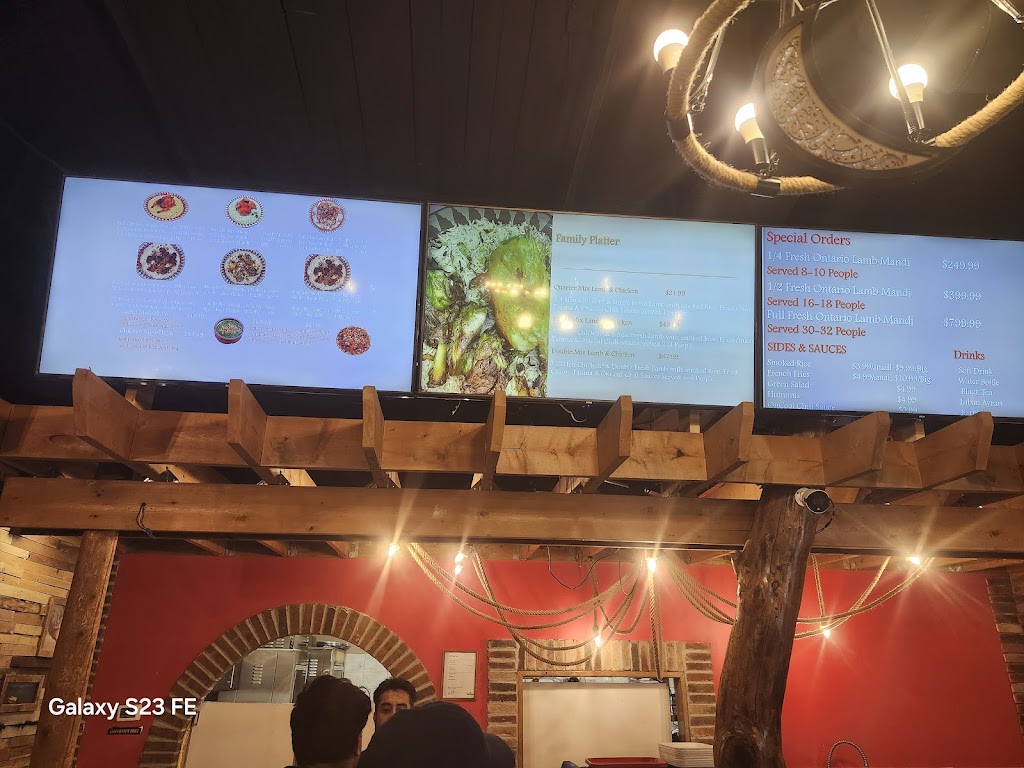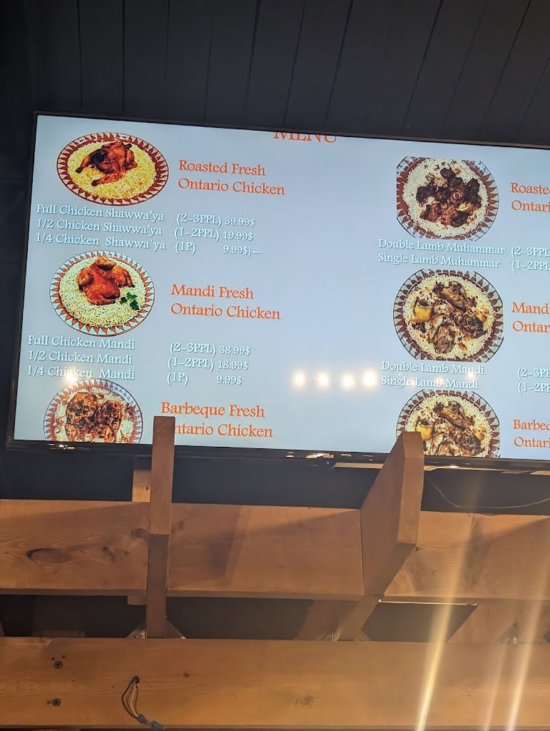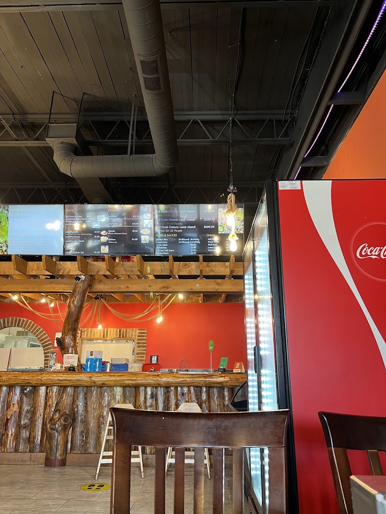 A few friends and I recently visited on coal through a recommendation I received recently. And WOW what an experience, the interior was so nice and very well themed , they had traditional ground areas to eat, prayer areas, and plenty of tables! Each table had a plastic wrap that you can eat on, super unique (first restaurant I've been to like this). Service was SUPER fast, they finished making our food in less than 15 minutes. We were a group of 5 and ordered the "Double mix lamb and chicken mandi", it was amazing! Lamb and chicken were so tender, and flavorful, and the rice was cooked perfectly and well seasoned, they are so generous with their portions, that we had 2 take out containers full of rice afterwards. We also got 5 cans of pop, and in total it cost us about 20 dollars per person, so much value! Employees were super kind, and were more than happy in providing us extra sauces at no extra charge. I will definitely be coming back here regularly, really excited to try out other dishes they have. This is the perfect place for big groups who like sharing their meals, definitely a Waterloo gem. . Do yourself a favor and visit! Overall review 9/10 Well done!