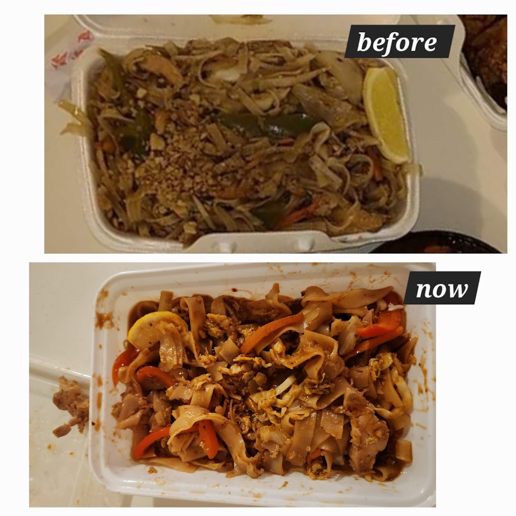 Outrageously bad! I've ordered from there fairly frequently. Tonight I ordered pad Thai and sesame chicken. The pad Thai was a much smaller portion, tasted different than before, and was way too spicy to be mild. The sesame chicken was absolutely disgusting. I called because it doesn't at all match the menu description ! "Deliciously sweet, salty, crispy chicken pieces served with dried chilli, onions, pepper, ginger and garlic." No peppers no onions... just chicken in brown gravy with sesame seeds sprinkled on top. The man I spoke to basically told me too bad. He also let slip that they just took over 2 weeks ago. That makes so much sense cause it's nothing like it was any other time! He wouldn't give me a refund when I offered to return the chicken. I won't eat that. I went through doordash and got customer service. I will never in life buy even a tic tac from this place! Um there is rice on there because I took some rice and tasted it! How would I know it was gross if I didn't taste it?! Did I take the peppers and onions out?! Are you serious?! You're going to derail the 2 years of good reputation this place had in a matter of days. Those aren't even the standard pad Thai noodles by the way. There wasn't even bean sprouts! I added a pic of the pad thai since you want to be funny. The piece of chewed up chicken is one i had to pull out of my mouth cause it was all gristle. Please lie to someone else. It's just embarrassing at this point. Let me go ahead and add an old photo of what the pad Thai used to look like. You were better off not saying anything to me than to come on and start spewing lunacy. Those look like the same to you? And I've never had pad Thai from this location that was spicy so yes, there is indeed mild pad thai! Maybe not from whatever jar you dumped onto the wrong noodles though. The menu literally lists it as mild! I made some old pics vs what I got pics since you seem confused. Hope this helps! In the future, play with your kids, not me. Smooches