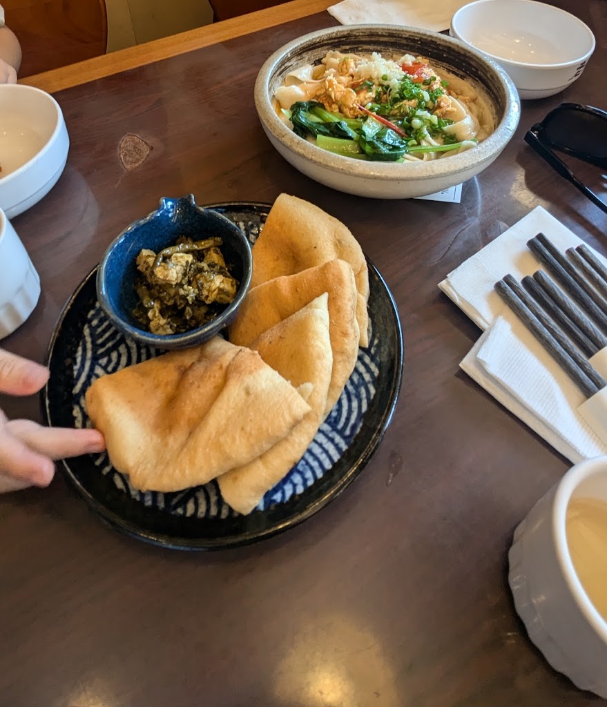 There mid week lunch, 3/4 full about 10 tables, service a little slow, pleasant, ordered ripped noodles with pork for 2 $24.99. Amazing flavours but would have liked more noodles and broth