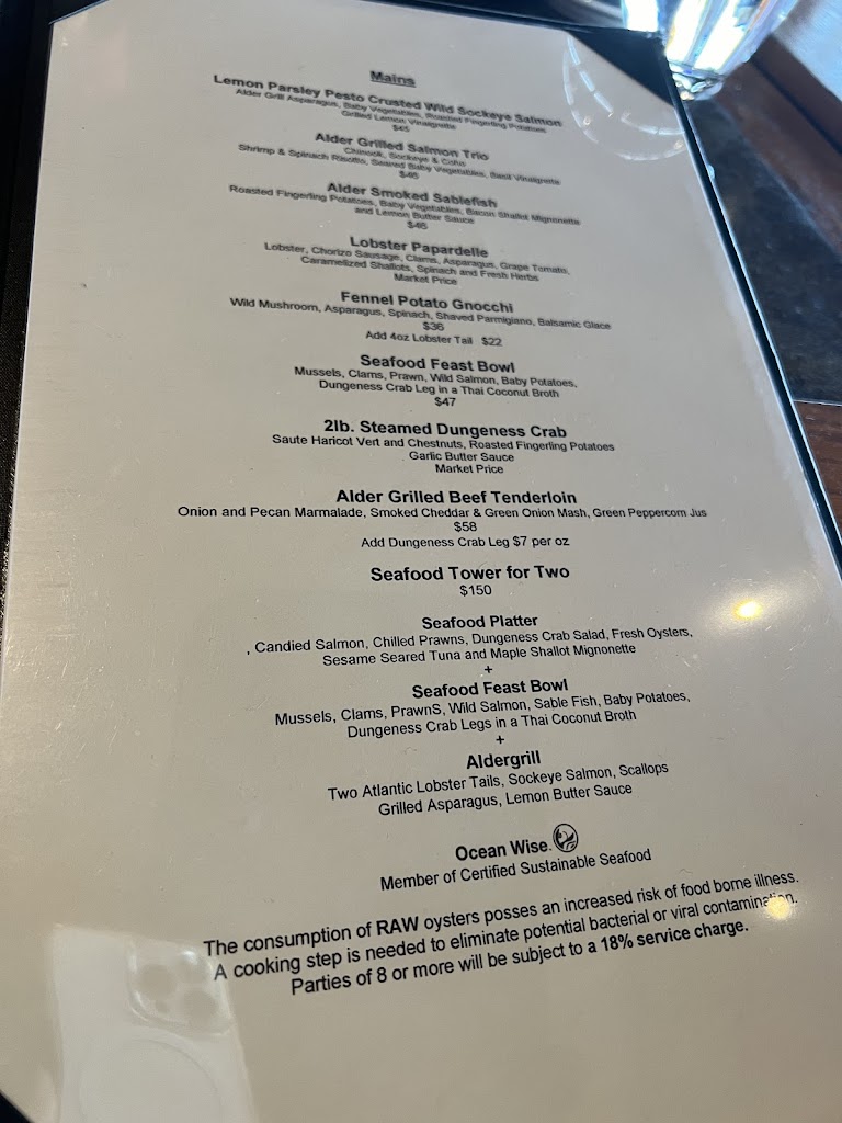 This is one of Vancouvers OG restaurants. Most days it has a great view. Contemporary West Coast cuisine with an emphasis on Alder grilled seafood. The seafood tower is a great shareable choice. The alder grilled salmon trio is a good sampler choice. They have an extensive wine list and the desserts are excellent