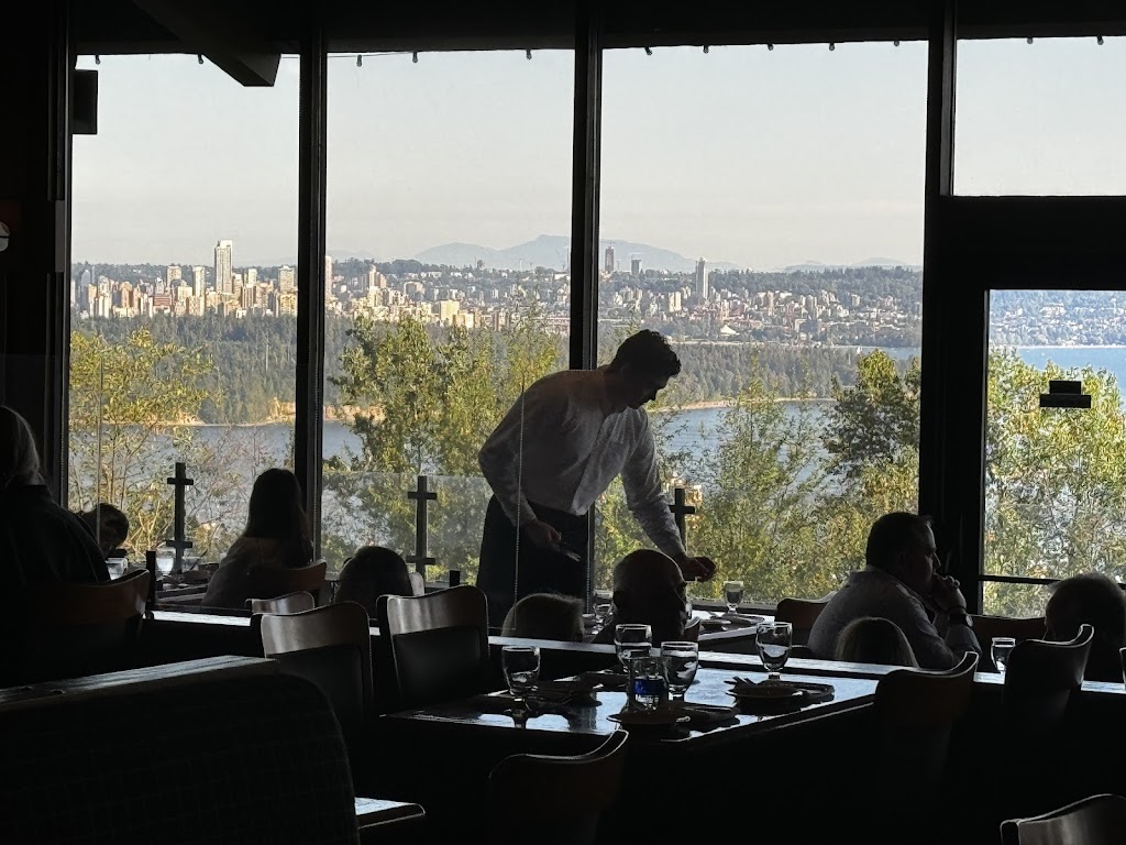 An outdated old school restaurant. Old-fashioned cuisine, service not customer-oriented. The view of Vancouver is incredibly beautiful. Unfortunately you can only see this through dirty windows. Our request to go to the terrace to take photos was rejected. Even after paying the bill, which was very high even for Vancouver and disproportionate to the service, it was impossible to take a photo of Vancouver at night on the freely accessible terrace. The passages were blocked with thick chains. The whole restaurant and customer friendliness was a completely overpriced disappointment. I can only advise against this restaurant.
