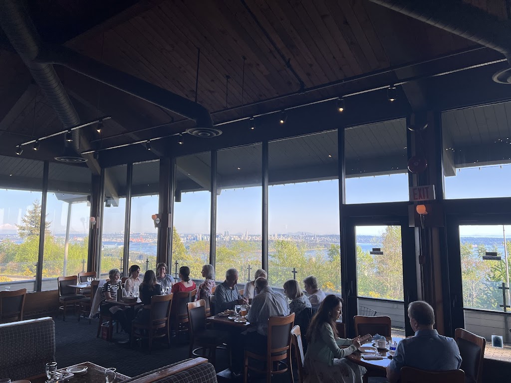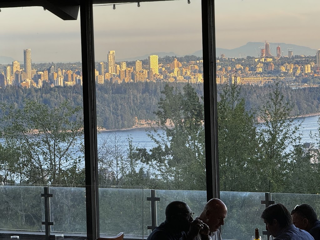 A fabuloys location. Off Chippendale Road in West Vanouver with views of English Bay and downtown Vancouver. Spectacular. The service was amazing. Really knowledgeable and helpful server. Really offered us a clinic. I cant day enough about how professional and helpful he was. I had salmon with pesto and enjoyed it. The others had salmon three ways and thought it was OK, but not remarkable. The samon was a little over-cooked. The others shared a sea food tower and said it was good. The desserts were good - creme brule and a pecan tart. It was a nice night.